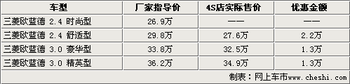 歐藍德是三菱引入國內(nèi)銷售的中型SUV車型,同時歐藍德也是三菱汽車第一款采用轎車底盤形式生產(chǎn)的SUV車型。近日我們從三菱汽車官方獲悉到,全新一代的歐藍德車型將于10月13日正式上市,首次推出的車型分為2.4和3.0兩種排量,共計4款車型。與此同時根據(jù)網(wǎng)上車市價格監(jiān)測系統(tǒng)顯示,目前銷售的09款歐藍德全系均出現(xiàn)了大幅優(yōu)惠,最高降幅高達2.2萬元。具體車型售價見下表:
