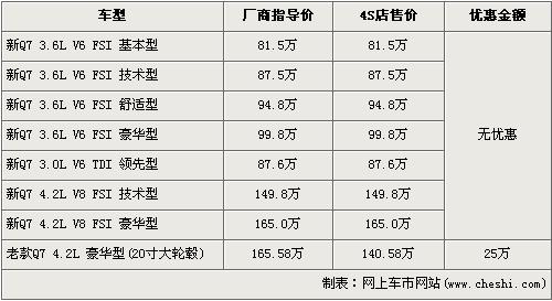 2009年9月4日,一汽-大眾奧迪銷售事業(yè)部宣布新奧迪Q7正式上市,在原有3.6 FSI、4.2 FSI兩款汽油直噴發(fā)動機(jī)基礎(chǔ)上奧迪首次將全球領(lǐng)先的3.0 TDI渦輪增壓柴油直噴發(fā)動機(jī)引入中國,使新奧迪Q7形成了包括3種排量7款車型的強(qiáng)大產(chǎn)品陣容,價格區(qū)間為81.5至165萬元。近日,奧迪Q7全系出現(xiàn)了最高25萬元的優(yōu)惠,具體價格行情請看下表: