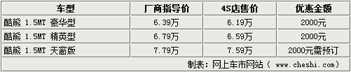 酷熊作為長(zhǎng)城汽車(chē)在市場(chǎng)上推出的第三款轎車(chē)產(chǎn)品,憑借極具個(gè)性的造型和寬大的內(nèi)部空間,使很多消費(fèi)者都對(duì)其非常感興趣。新車(chē)價(jià)格分別為豪華型6.39萬(wàn)元、精英型6.79萬(wàn)元,天窗版7.79萬(wàn)元。近日,網(wǎng)上車(chē)市網(wǎng)站了解到,長(zhǎng)城汽車(chē)4S店處的天窗版酷熊仍然處在無(wú)車(chē)銷(xiāo)售的狀態(tài),其他兩款車(chē)型有現(xiàn)車(chē)銷(xiāo)售,可以給出2千元的優(yōu)惠。具體詳情如下: