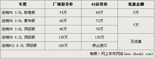 途銳是大眾首款引進我國的SUV車型,在3.6L及4.2L率先上市后,大眾為了滿足消費者的更大胃口,緊接著又推出了搭載12缸發(fā)動機的6.0L車型。隨著大排量消費稅的頒布,給9月份后入關(guān)的大排量車型帶來了一次不小的沖擊,令大排量汽車價格都上調(diào)了不少。近日據(jù)網(wǎng)上車市價格系統(tǒng)監(jiān)測顯示,大眾途銳的6.0L車型已經(jīng)停止進口,并且購買目前購車可以得到最高7萬元的優(yōu)惠,具體詳情請看下表: