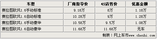 東風(fēng)悅達(dá)起亞旗下的首款兩廂轎車(chē)—賽拉圖歐風(fēng),憑借著歐洲車(chē)型的設(shè)計(jì)理念和圓潤(rùn)飽滿(mǎn)的外形,得到消費(fèi)者的關(guān)注。近日記者了解到:賽拉圖歐風(fēng)將推出1.5排量車(chē)型,屆時(shí)1.6車(chē)型將全部停產(chǎn)。根據(jù)網(wǎng)上車(chē)市價(jià)格監(jiān)測(cè)系統(tǒng)顯示,目前銷(xiāo)售的賽拉圖歐風(fēng)最高優(yōu)惠1.3萬(wàn)元。具體車(chē)型見(jiàn)下表: