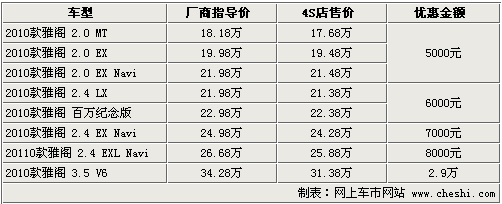 雅閣一直是中級(jí)車市場最受矚目的車型之一,棱角分明的外觀以及舒適的內(nèi)飾空間以及豪華程度成為眾多商務(wù)人士最佳選擇。廣州本田在推出2010款車型后,使雅閣整車的性價(jià)比進(jìn)一步提升。據(jù)網(wǎng)上車市價(jià)格監(jiān)測系統(tǒng)顯示:目前雅閣的優(yōu)惠幅度有所降低,最高優(yōu)惠2.9萬元。具體車型行情如下: