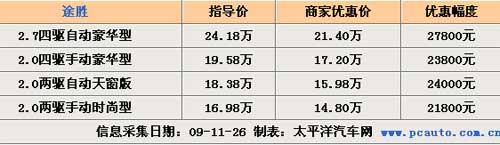 日前,編輯走訪北京現(xiàn)代二級經(jīng)銷商時(shí)了解到,目前購買途勝全系車型可享受最高2.78萬元現(xiàn)金優(yōu)惠,其中2.0兩驅(qū)手動時(shí)尚型最終售價(jià)僅為14.8萬元,優(yōu)惠后的性價(jià)比還是很不錯(cuò)的,店內(nèi)現(xiàn)車情況較充足,具體詳情見下表:
