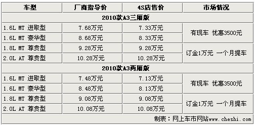奇瑞A3是奇瑞汽車所生產的一款成功轉型的產品,自上市以來激起了廣大消費者對自主品牌追捧的新浪潮。奇瑞A3外觀時尚、運動,迎合時代潮流,超高的性價比造就了奇瑞A3的銷量直線上升。2010款奇瑞A3的表現(xiàn)也不遜色于老款產品,增加了更多時尚元素和實用配置。網(wǎng)上車市走訪了北京地區(qū)奇瑞4S店,得到了2010款奇瑞A3最新的市場消息,具體信息請參考下表: