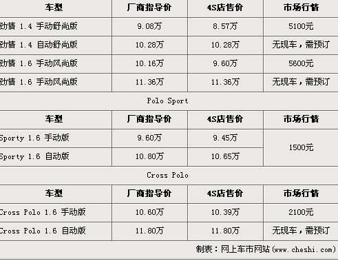 據(jù)上海大眾北京經(jīng)銷店銷售人員介紹,兩廂Polo分為勁情、Sporty以及Cross版三種車型,勁情版的手動(dòng)舒尚版以及手動(dòng)風(fēng)尚版有現(xiàn)車,并且手動(dòng)風(fēng)尚版的5600元優(yōu)惠現(xiàn)金達(dá)到了全系的最高。而Sporty版車型店內(nèi)有現(xiàn)車,主要顏色為銀色車型,并且有1500元的現(xiàn)金優(yōu)惠。Cross版車型手動(dòng)版有現(xiàn)車,并且有1500元的現(xiàn)金優(yōu)惠。欲購買無現(xiàn)車的消費(fèi)者,需交訂金1000元,約等1個(gè)月可提車。
