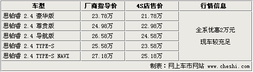 東風(fēng)本田旗下的首款運(yùn)動中高級車型——思鉑睿于09年9月初上市,全系共計五款車型,售價為23.78萬元—27.18萬元。上根據(jù)網(wǎng)上車市價格監(jiān)測系統(tǒng)顯示,目前購買思鉑睿全系可優(yōu)惠現(xiàn)金2萬元,現(xiàn)車方面較為齊全。具體車型行情如下: