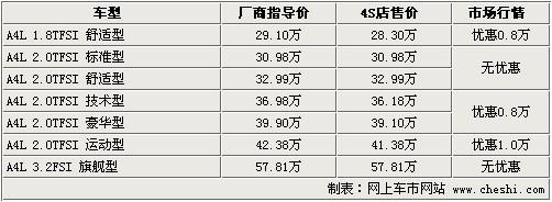 據(jù)北京一汽奧迪經(jīng)銷店銷售人員介紹:目前A4L全系現(xiàn)車比較齊全,除1.8TFSI及3.2L車型現(xiàn)車較少以外,其余車款均有現(xiàn)車。現(xiàn)車顏色主要有銀色、灰色、紅色等,如預(yù)定其他顏色車型需預(yù)定,預(yù)定最少等20天,最長等待1個半月。1.8TFSI及3.2L車型等待時間較長,需等3個月時間。優(yōu)惠方面,目前全系最高優(yōu)惠1萬元,其余車型均有8000元左右的優(yōu)惠幅度。現(xiàn)購車取消了加價,并還有一定幅度的優(yōu)惠,此時購車比較劃算,喜歡的消費者請及時與店內(nèi)聯(lián)系。