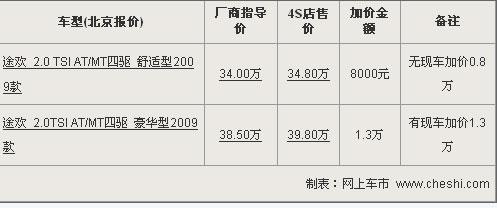 在途觀面前,Tiguan顯得有些復(fù)雜。進(jìn)口大眾官方自Tiguan上市以來(lái)共推出2款車(chē)型,分別為舒適版與豪華版。Tiguan舒適版指導(dǎo)價(jià)為34萬(wàn),豪華版指導(dǎo)價(jià)為38.5萬(wàn)。但在北京各4S店處,售價(jià)均上漲為34.8萬(wàn)、39.8萬(wàn),兩款車(chē)分別比指導(dǎo)價(jià)高出8000元-13000元不等。Tiguan舒適版目前各店均無(wú)現(xiàn)車(chē)銷(xiāo)售,如預(yù)訂最快需等到4月底;而豪華版車(chē)型4S店有少量現(xiàn)車(chē),且最高可在39.8萬(wàn)元的基礎(chǔ)上優(yōu)惠1萬(wàn)元,最低售價(jià)38.8萬(wàn)元。顏色不是非常齊全,各店現(xiàn)車(chē)情況有所不同。