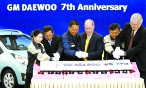 10月15日,韓國仁川,通用大宇慶祝7歲生日。通用汽車首席執(zhí)行官韓德勝(右三)、通用汽車公司執(zhí)行副總裁羅瑞立(右一)與通用大宇領(lǐng)導(dǎo)層切蛋糕。在當(dāng)日的新聞發(fā)布會上,韓德勝稱,出售歐寶的談判仍在繼續(xù)進行。2001年10月17日,通用汽車與其合作伙伴鈴木汽車及上汽集團,共同收購了大宇汽車66.7%的股份。