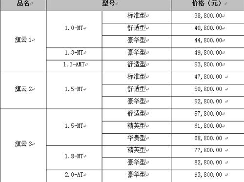 整合后的旗云品牌將面對(duì)大眾消費(fèi)者,以“務(wù)實(shí)、家庭、信賴”為品牌內(nèi)涵,為消費(fèi)者提供可以輕松擁有、值得信賴的汽車產(chǎn)品,現(xiàn)階段主要包括旗云1、旗云2和旗云3三款產(chǎn)品,分別在A0級(jí)、A級(jí)、A+級(jí)三大市場(chǎng)中豎立“空間、節(jié)能、性價(jià)比”新標(biāo)桿。同時(shí)在未來,旗云品牌將進(jìn)一步豐富產(chǎn)品線和品牌內(nèi)涵,從而滿足國(guó)內(nèi)汽車市場(chǎng)差異化的需求。