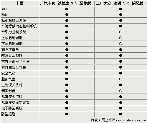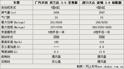 這兩款SUV車型均搭載的是V型6缸發(fā)動(dòng)機(jī),排量都在3.5升這個(gè)區(qū)間。但是在發(fā)動(dòng)機(jī)技術(shù)上卻存在著本質(zhì)區(qū)別。廣汽豐田漢蘭達(dá)的發(fā)動(dòng)機(jī)配備了雙VVT-i技術(shù),實(shí)現(xiàn)了卓越的動(dòng)力輸出,同時(shí)進(jìn)一步提高了燃油經(jīng)濟(jì)性。進(jìn)口大眾途銳則配備的是動(dòng)力更加突出FSI發(fā)動(dòng)機(jī),該發(fā)動(dòng)機(jī)采用燃油缸內(nèi)直噴技術(shù),這一點(diǎn)從最大功率和最大扭矩的輸出就可以看出。在變速器方面途銳則是略勝一籌,配備了6速手自一體變速箱,令變速更平滑順暢,該變速器還帶有DSP的智能動(dòng)力換檔系統(tǒng),能辨認(rèn)出您的變速習(xí)慣,使駕駛員充分享受到駕駛的樂(lè)趣。進(jìn)口大眾途銳剎車系統(tǒng)采用的是散熱性能良好的前后通風(fēng)盤,漢蘭達(dá)采則采用的是前通風(fēng)后實(shí)心。