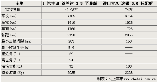 廣汽豐田漢蘭達(dá)和進(jìn)口大眾途銳均屬于一個(gè)級(jí)別的城市SUV車型,我們選取的兩款車型均是3.5排量這個(gè)級(jí)別的車型,但是在售價(jià)方面卻相差了31萬(wàn)元。在車身尺寸方面,國(guó)產(chǎn)漢蘭達(dá)在車長(zhǎng)、車高、均超過(guò)了進(jìn)口大眾途銳,這一點(diǎn)保證了其內(nèi)部頭部空間的寬敞。在軸距方面,進(jìn)口大眾途銳要比廣汽豐田漢蘭達(dá)長(zhǎng)出了65mm,這一點(diǎn)意味著途銳的腿部空間將會(huì)優(yōu)越于漢蘭達(dá)。在越野性能方面,從上表數(shù)據(jù)可以看出漢蘭達(dá)的離地間隙分別達(dá)到了203mm,接近角和離去角分別達(dá)到了29°和24°,這樣的參數(shù)應(yīng)該可以滿足一般的越野路況。越野方面進(jìn)口大眾途銳沒(méi)有提供越野參數(shù)數(shù)據(jù)。進(jìn)口大眾途銳的油箱達(dá)到了100升,使您完全沒(méi)必要去考慮長(zhǎng)途旅行沒(méi)油的問(wèn)題。