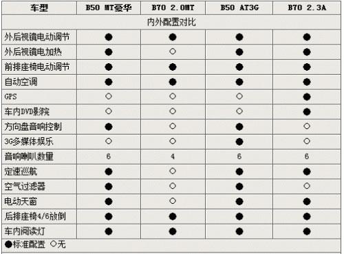 通過此項(xiàng)的對比,可以發(fā)現(xiàn)兩款兄弟車型在外觀以及內(nèi)部的絕大多數(shù)配置均極為近似,僅僅是在高配車型之上有了一些不同的豪華系統(tǒng),如B70 2.3AT豪華車型上的GPS以及DVD系統(tǒng),還有B50 AT3G版之上的多媒體娛樂系統(tǒng)等等。而B50全息均配備了定速巡航系統(tǒng),也是新車的一大亮點(diǎn)!