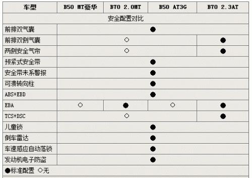 在安全裝備上,奔騰B50五款車型采用的是同樣的配置,前排雙氣囊、駕駛員自動預(yù)緊安全帶、駕駛員安全帶未系報警等都為標(biāo)配,防炫目內(nèi)后視鏡、后門兒童鎖、間歇式寬幅雨刷都為保障駕駛安全設(shè)計。相比B70的兩款對比車型則少了EBA以及TCS和DSC輔助安全系統(tǒng)。