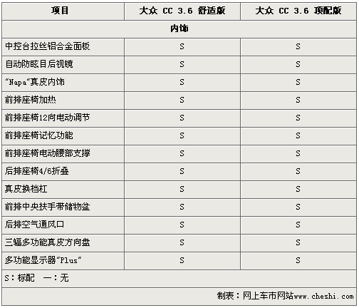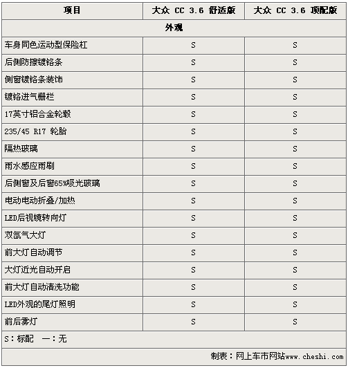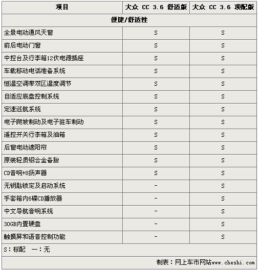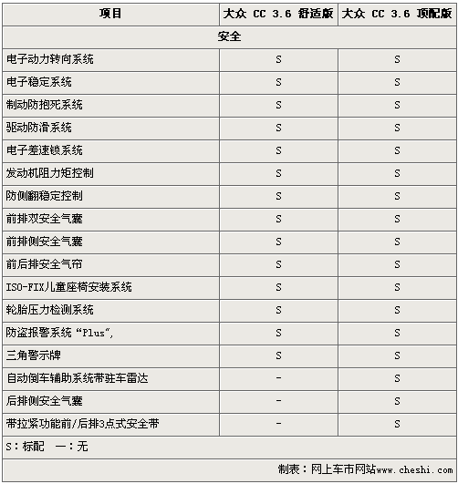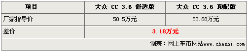 由于大眾CC 舒適版和頂配版同樣配備3.6升FSI引擎和6速DSG雙離合變速箱,所以兩款車的差價主要體現(xiàn)在車型配置方面。在外形和內飾方面,大眾CC 舒適版和頂配版沒有本質區(qū)別,而在安全配置和舒適配置方面,兩款車型存在一定得差異。