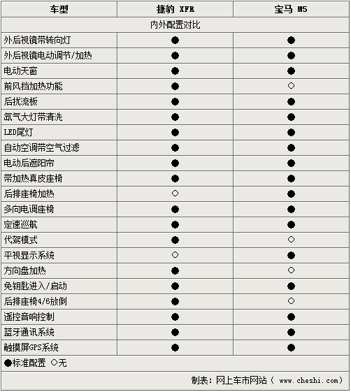 既然提到兩款車均為豪華車型,舒適配置當然也是不能被忽視的一面。捷豹XFR則在此方面表現(xiàn)的可圈可點,多項高端配置均一一齊備。而價格相差3萬的寶馬M5在此方面則略顯遜色,看來寶馬車型更加在乎駕駛樂趣。但從此方面則證明了捷豹XFR為有機會乘坐其中的駕乘者想的更多,不僅滿足了駕駛與運動的樂趣,也可直接享受更多的舒適及便利。