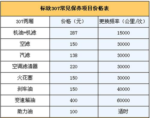 5.保養(yǎng)費(fèi): 我們向標(biāo)致4S店售后服務(wù)人員咨詢過,他們說307一大優(yōu)勢是保養(yǎng)周期比較長,1.5萬公里才需要保養(yǎng)一次,是同級車型中保養(yǎng)花費(fèi)最低的。通常新車首保在7500公里時(shí)進(jìn)行,以后每1.5公里保養(yǎng)一次。第二次1.5萬公里時(shí)的常規(guī)保養(yǎng)(更換機(jī)油機(jī)濾)需花費(fèi)287元;3萬公里保養(yǎng)(更換機(jī)油機(jī)濾+空濾+空調(diào)濾芯+汽濾+火花塞)為795元;4.5萬公里保養(yǎng)(更換機(jī)油機(jī)濾)花費(fèi)287元;6萬公里保養(yǎng)(更換機(jī)油機(jī)濾+空濾+空調(diào)濾芯+汽濾+火花塞)為795元。