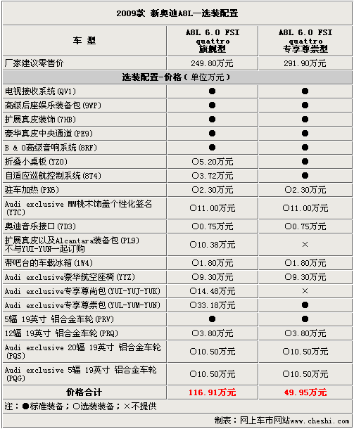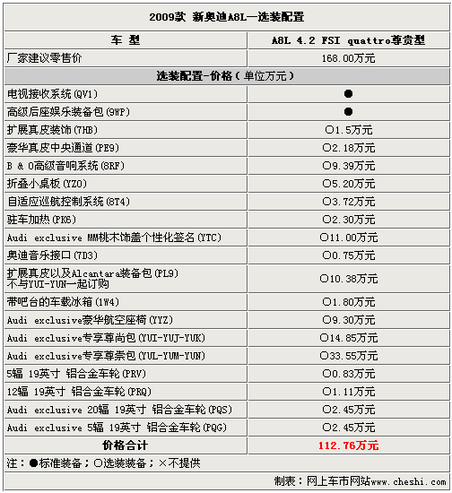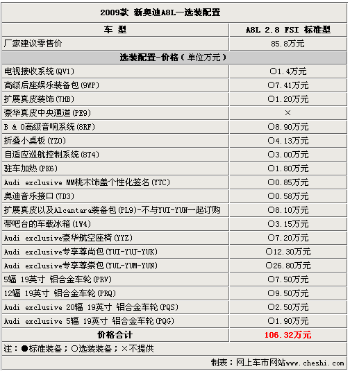 以上的選裝配置需要在預訂車輛前選擇好,經銷商會根據客戶的訂單向廠家發(fā)送配置代碼。09款奧迪A8L的選裝配置十分豐富,完全可以滿足對配置有需求消費者的“苛刻”要求。當然,這些配置也需要不菲的金錢才可以擁有,究竟哪些配置適合有品位懂得享受的您呢?