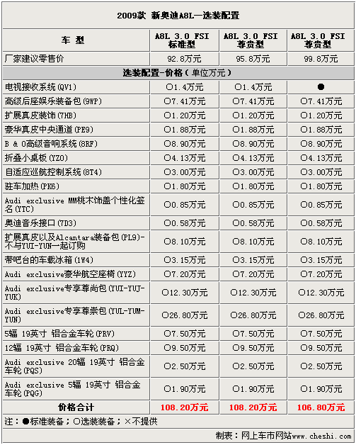 新上市的奧迪A8L 3.0FSI主打性價比,在標準配置上要高于奧迪A8L 2.8FSI。在選裝配置上,價格略低的基本型以及豪華型可以選裝所提供的全部的配置,總價均超過了百萬元。而售價接近百萬元的尊貴型除了價值1.4萬元的“電視接收系統”為標準配置外不必選裝,其余配置均需要選裝。