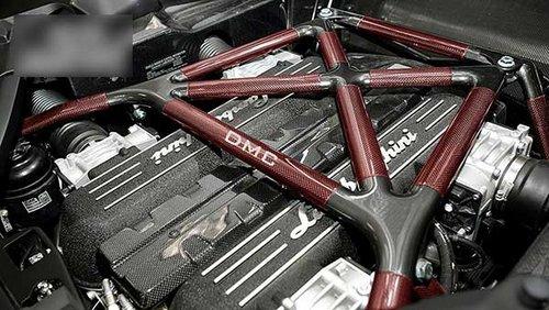 打開背部的引擎蓋,可以發(fā)現(xiàn)一個印有DMC字樣的紅色碳纖加強架,在加強架下的V12引擎經(jīng)過重新DMC的ECU刷寫后,馬力提升至670匹的水平。經(jīng)過測速,這臺Quattro Veloce在0-96的加速時間只需3.2秒,可見Murcielago強大的改裝潛力。