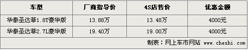 據(jù)4S店銷售人員介紹,目前圣達菲在北京地區(qū)銷售的主要是汽油版1.8T和2.7高配車型。其中2.7排量高配車型售價為19.4萬,1.8T國四排放標準的豪華版售價為13.88萬元。目前購車可以優(yōu)惠現(xiàn)金4000元,如果到店的話還能有一定幅度的讓利,F(xiàn)車方面,主要有銀色、黑色、白色以及灰色等供應,可供挑選的余地很大。另據(jù)介紹,柴油版車型在北京均無法上牌,而這兩款不存在此問題。