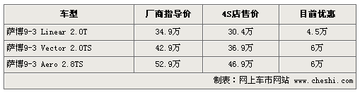 據(jù)4S店銷售人員介紹:目前薩博9-3現(xiàn)車較充足,最高優(yōu)惠可達(dá)6萬元,標(biāo)準(zhǔn)型薩博9-3目前優(yōu)惠4.5萬。如需訂購顏色較少的車,等待時(shí)間在1-2周左右。