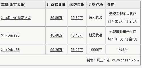 據(jù)寶馬4S店銷售人員介紹:目前寶馬X1共有三款車型,如消費(fèi)者預(yù)訂這3款車型,訂金統(tǒng)一為5萬元。寶馬X1 28目前有現(xiàn)車,但提車需加價(jià)1萬元。18i及25i目前無現(xiàn)車,購車需加價(jià)3萬元。由于X1現(xiàn)車較少,所以預(yù)定需等時(shí)間較長。