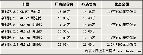 據(jù)4S店銷售人員介紹,目前購(gòu)買獅跑可以贈(zèng)送960元的交強(qiáng)險(xiǎn),同時(shí)有1.5萬(wàn)-2萬(wàn)元不等的現(xiàn)金優(yōu)惠。兩驅(qū)標(biāo)準(zhǔn)版優(yōu)惠后售價(jià)僅為14.48萬(wàn)元。目前經(jīng)銷商處有黑色、銀色等現(xiàn)車供應(yīng),藍(lán)色等款需要預(yù)定,訂金為2千元,月內(nèi)便可以順利提車。