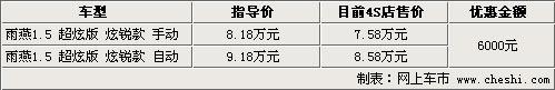 長安鈴木雨燕以其圓潤優(yōu)雅的外形,逐漸受到了消費(fèi)者的青睞,新雨燕自從上市以來,其銷售情況一直比較穩(wěn)定。由于排放問題的影響,因此1.3L雨燕在北京市場上已經(jīng)不再銷售。目前在北京市場上,購買長安鈴木雨燕1.5L超炫版炫銳款可以得到6000元的優(yōu)惠。具體車型詳見下表: