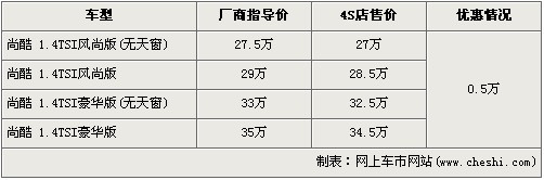 與高爾夫六代同平臺(tái)的大眾Scirocco尚酷轎跑車,自從廣州車展上正式發(fā)布后,便引起了眾多車友的關(guān)注。大眾Scirocco尚酷轎跑車采用了大眾IROC概念車的大量設(shè)計(jì)元素,激進(jìn)的外觀給人留下了深刻的印象。大眾Scirocco尚酷轎跑車分為1.4T和2.0T兩種排量車型,先期上市的為1.4T車型。近日據(jù)我走訪北京多家大眾4S店得知,大眾尚酷1.4T全系出現(xiàn)5000元優(yōu)惠,具體車型價(jià)格請(qǐng)看下表: