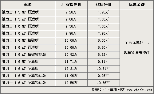 雅力士在歐洲是一款非常受歡迎的A0級小車,但在08年進(jìn)入國內(nèi)銷售后,其銷量并不樂觀,但是從這款車的配置、安全性方面,仍然是一款值得購買的小車。根據(jù)網(wǎng)上車市價(jià)格監(jiān)測系統(tǒng)顯示,目前雅力士銷售比較火爆,現(xiàn)車緊缺,近期購買雅力士全系車型可以優(yōu)惠2萬元。具體行情如下: