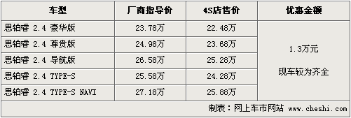 東風本田思鉑在09年9月初上市,全系共計五款車型,售價為23.78萬元—27.18萬元。上市后一直備受關注,訂單和銷量也持續(xù)增加。根據(jù)網(wǎng)上車市價格監(jiān)測系統(tǒng)顯示,目前購買思鉑睿全系可優(yōu)惠現(xiàn)金1.3萬元,現(xiàn)車方面較為齊全。具體車型行情如下: