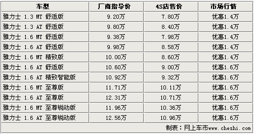 雅力士是一款在國(guó)內(nèi)非常受歡迎的A0級(jí)小車(chē),從這款車(chē)的配置、安全性方面,都是一款值得購(gòu)買(mǎi)的小車(chē)。根據(jù)網(wǎng)上車(chē)市價(jià)格監(jiān)測(cè)系統(tǒng)顯示,近期雅力士最高優(yōu)惠1.6萬(wàn)元,目前有部分型號(hào)的現(xiàn)車(chē)供應(yīng)。具體車(chē)型行情如下: