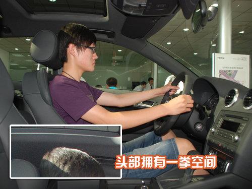 A3算是奧迪家族里面身材最為迷你的一位成員了,三圍參數(shù):4292mm*1765mm*1423mm,軸距為2578mm,絕對(duì)的緊湊級(jí)身材。視覺從車外直觀看過去,相對(duì)低矮的車身有點(diǎn)擔(dān)心空間的問題,測(cè)試者178CM。