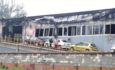 4S店的維修車間被燒毀,消防員正在現(xiàn)場處理。王苡萱攝