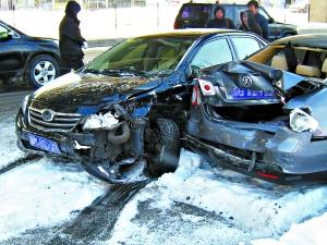 在距離事發(fā)地點不到5米的一家汽車銷售店上班的閻先生稱,事發(fā)時外面很安靜,他和店里的同事接連聽見兩下撞擊聲,出門就看到慘劇發(fā)生。豐田車的左前側(cè)受損嚴(yán)重,前輪搖搖欲墜。而速騰車和廣本車的車尾部被撞嚴(yán)重,完全癟了進去,其中速騰車后備箱里的備胎還被撞了出來!罢厥仑S田車?yán)镉?人,司機下車后還是鎮(zhèn)定地安撫乘客!遍愊壬f,被撞的男子趴在雪地里,頭上滿是鮮血。隨后999趕到,據(jù)急救人員稱,剛開始男子還有呼吸,但2分鐘之后,男子死亡。