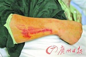 昨天晚上,記者趕到了救治黃國順的中山三院。當時,護士正在為他換藥包扎傷口,黃國順指了指床下的染紅藥布,告訴記者這是他妻子剛剛為他擦掉的血跡。