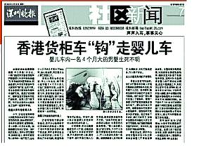 ●4月25日,深圳市龍崗區(qū)南灣街道發(fā)生一宗貨柜車拖掛嬰兒車肇事逃逸案件。被拖嬰兒下落不明,生死難料。