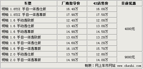 據(jù)4S店銷售人員介紹:目前明銳全系最高優(yōu)惠9000元,1.6升及1.8TSI車型優(yōu)惠減少,尤其1.8TSI車型由原來(lái)的8500元降至4000元。2.0升目前優(yōu)惠9000元,優(yōu)惠幅度很大,并且2.0升車型有現(xiàn)車,顏色包括銀色、灰色車型。1.6升車型全系現(xiàn)車少,如需預(yù)定最短等待1個(gè)半月,最長(zhǎng)需等3個(gè)月時(shí)間。目前1.6升車型優(yōu)惠達(dá)4000元,1.8TSI的兩款車型優(yōu)惠4000元。如在店內(nèi)做裝飾還可打折,雖然折后裝飾價(jià)格仍有些偏高,但產(chǎn)品質(zhì)量可以保證。