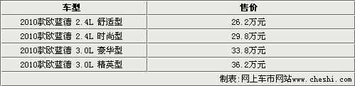 2010款三菱歐藍(lán)德共推出四款車(chē)型,分為2.4L和3.0L兩種排量,其中2.4L舒適型為兩驅(qū)版,售價(jià)26.2萬(wàn)元。其他三款車(chē)型均為四驅(qū)版,售價(jià)29.8萬(wàn)元、33.8萬(wàn)元和36.2萬(wàn)元。據(jù)悉,目前2010款歐藍(lán)德只有少數(shù)展車(chē)到店,大部分車(chē)型現(xiàn)在都只能預(yù)訂,大概需要七個(gè)工作日即可提車(chē)。