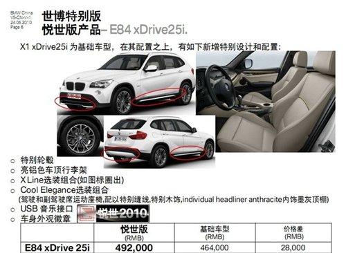 | 寶馬X1 xDrive25i悅世版 | 49.20 | 個性化輪轂、運動套件、世博徽標 |