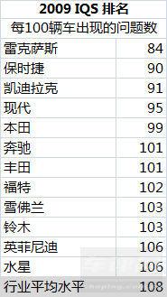 JD Power的2009年研究,訪談超過了80900名買家,關(guān)于他們頭三個(gè)月的使用情況,共提問228個(gè)問題,這項(xiàng)研究從2月進(jìn)行到5月。這項(xiàng)研究共包括了37個(gè)品牌,基于2009款車型,統(tǒng)計(jì)在頭90天內(nèi)被車主發(fā)現(xiàn)的質(zhì)量問題。
