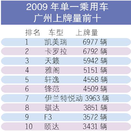 2009年單一乘用車廣州上牌量前十