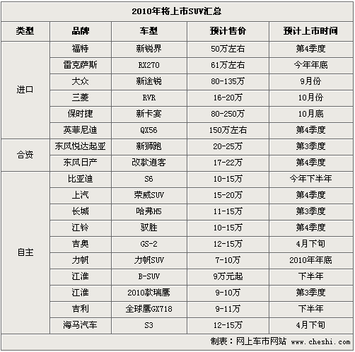 從年初至今,已經(jīng)上市的SUV車型達(dá)到了10款之多,而3月上市的就占到5款。其中上海大眾途觀在上市預(yù)售首月訂單就突破了4萬(wàn)輛的;隨后上市的國(guó)產(chǎn)奧迪Q5訂單已經(jīng)排到明年,目前購(gòu)買這兩款車仍需要加2.5萬(wàn)-3萬(wàn)元才能提到現(xiàn)車。而4月8日上市的iX35則又將在日系車市場(chǎng)掀起一股搶購(gòu)熱潮。