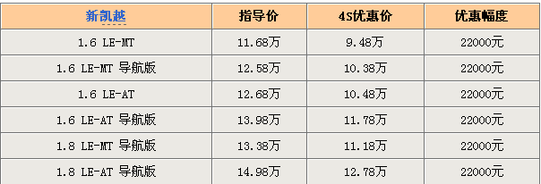 筆者日前走訪北京上海通用4S店時獲悉,目前新凱越優(yōu)惠再升2000元,達到了最高2.2萬元的讓利,這也是去年以來最高的優(yōu)惠記錄。由于現(xiàn)在新凱越庫存車較多,顏色齊全,對這款車感興趣的消費者近期可以出手了。