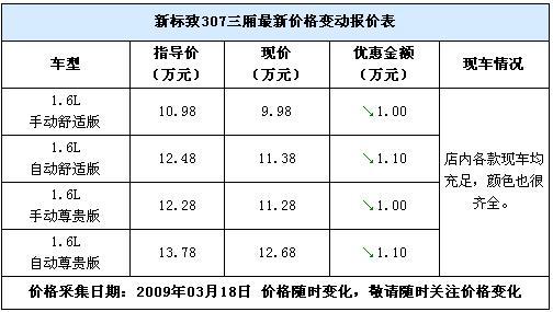近日,筆者走訪北京雙龍雅致東風(fēng)標(biāo)致4S店時了解到,目前店內(nèi)的307三廂1.6L車型優(yōu)惠有所加大,目前手動擋車型可以優(yōu)惠1萬元,自動擋車型可以優(yōu)惠1.1萬元,店內(nèi)現(xiàn)車充足,顏色也很齊全,詳細(xì)價格信息請見下表: