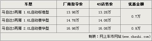 據經銷商處銷售人員介紹,目前馬自達3兩廂有1.6L和2.0L兩種排量共三款車型在售。馬自達3兩廂2.0L車型優(yōu)惠為9000元,1.6L車型優(yōu)惠為7000元。經7000元的優(yōu)惠后,1.6L自動標準型和1.6L自動豪華型售價仍為13.28萬元和14.08萬元,全系最高配的2.0L自動豪華型經9000元的優(yōu)惠后,售價為16.08萬元。