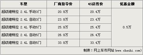 鈴木-新超級維特拉在國內(nèi)銷售已經(jīng)有將近半年的時(shí)間了,此車搭載了鈴木全新開發(fā)的2.4L和3.2L兩種引擎,而在車體結(jié)構(gòu)上分為了3門版與5門版,售價(jià)區(qū)間為20.9-33.9萬元。根據(jù)網(wǎng)上車市價(jià)格監(jiān)測顯示,鈴木-新超級維特拉全系優(yōu)惠5000元,具體詳情請看下表: