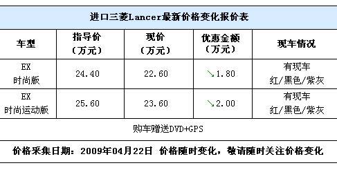 筆者近日從北京港龍基業(yè)經(jīng)銷商處獲悉,進(jìn)口三菱Lancer EX車型保持著最高2萬元的優(yōu)惠,并且近期購車還將獲贈DVD+GPS,現(xiàn)時尚型和時尚運動型現(xiàn)車充足,紅,黑,紫灰等常見顏色均有現(xiàn)車,感興趣的朋友可以與經(jīng)銷商聯(lián)系,詳細(xì)價格信息請見下表: