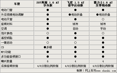 標致207、新飛度和雅力士雖然作為緊湊型A0級轎車,但是在舒適配置方面卻完全不輸給中高級轎車。雅力士配備了中高級轎車才配備的一鍵啟動按鍵,使得整車檔次有所提升。而新飛度則更是厲害在配備了自動空調的同時,還配備了高級轎車上才可以見到的撥片換檔器,使得該車更加具備了運動氣息。標致207配備帶有MP3功能多碟CD音響系統(tǒng),并且同時都具備多功能音響接口。讓人頗感遺憾,雅力士高配車型沒有配備電動天窗。